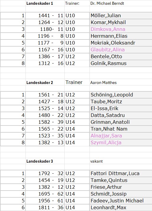 Ich möchte alle hier genannten Spieler und Spielerinnen bitten, über die Vereine oder selbstständig, an die nachfolgend genannte Mail Adresse (landesjugendwart@lsbb.de) eine Rückmeldung zu geben, ob Interesse am Kadertraining für das neue Jahr besteht oder nicht.